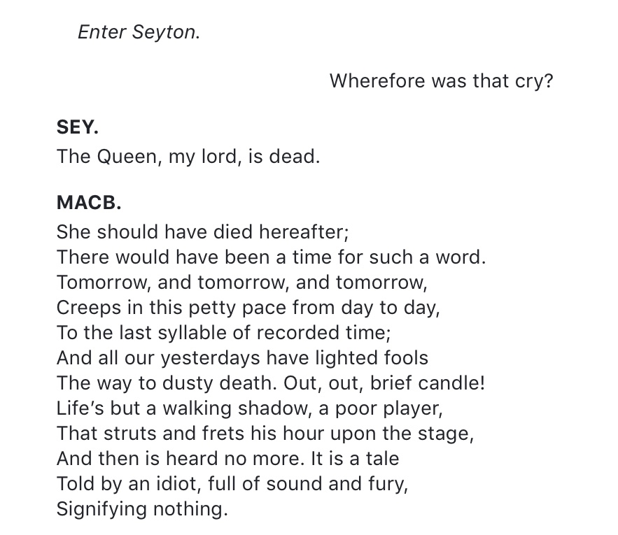 This short speech by Macbeth is his response to the news that Lady Macbeth is dead. It is not as emotional as Macduff’s response to the death of his wife and children, but instead is quite poignant and philosophical. A soliloquy might have been more expansive on his thoughts and feelings.